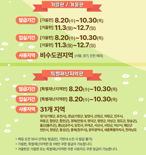 - 특별재난지역: 별도의 혜택으로 7만 원 이상은 5만 원, 7만 원 미만은 3만 원 할인