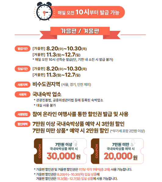 - 가을편: 숙박요금 7만 원 이상 결제 시 3만 원 할인, 7만 원 미만 시 2만 원 할인