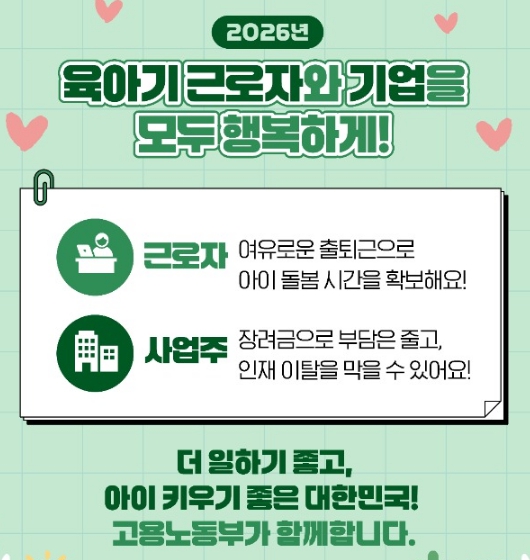 2026년부터 시행되는 육아기 10시 출근제는 임금 감소 없이 하루 근로시간을 줄일 수 있도록 사업주와 근로자를 동시에 지원하는 실질적인 일·가정 양립 제도입니다.