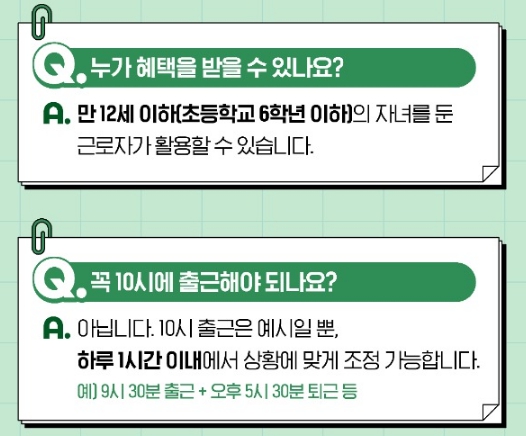 육아기 근로자는 아침 시간의 돌봄 부담을 줄이고, 자녀 일정에 맞춘 생활 리듬을 유지할 수 있습니다. 이는 육아 스트레스 완화뿐 아니라 업무 집중도 향상으로도 이어질 수 있습니다.