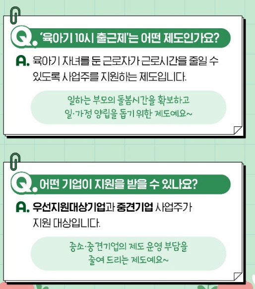 육아기 10시 출근제는 고용노동부의 ‘워라밸일자리장려금’ 제도 안에서 운영되며, 육아기 단축근무를 허용한 사업주를 지원하는 방식으로 설계되어 있습니다.