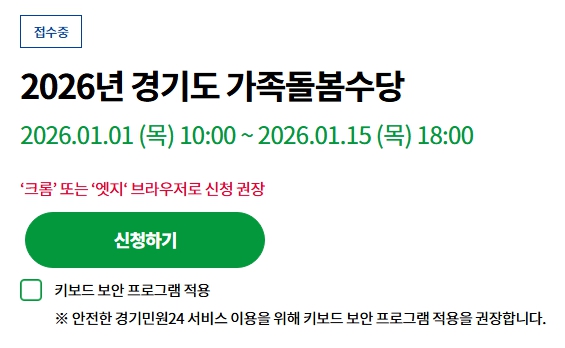 경기도는 가정 중심 돌봄이 필요한 영아 가구의 현실을 반영해 ‘2026년 경기 가족돌봄 수당’을 통해 양육 공백을 보완하고 돌봄 부담을 실질적으로 낮추고자 합니다.