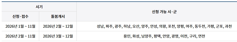 2026년 경기 가족돌봄 수당은 시·군별로 신청 일정이 다르게 운영됩니다. 성남, 파주, 하남, 광주, 오산 등 일부 지역은 1월부터 11월까지 신청이 가능하며, 이 경우 돌봄 인정은 2월부터 시작됩니다.