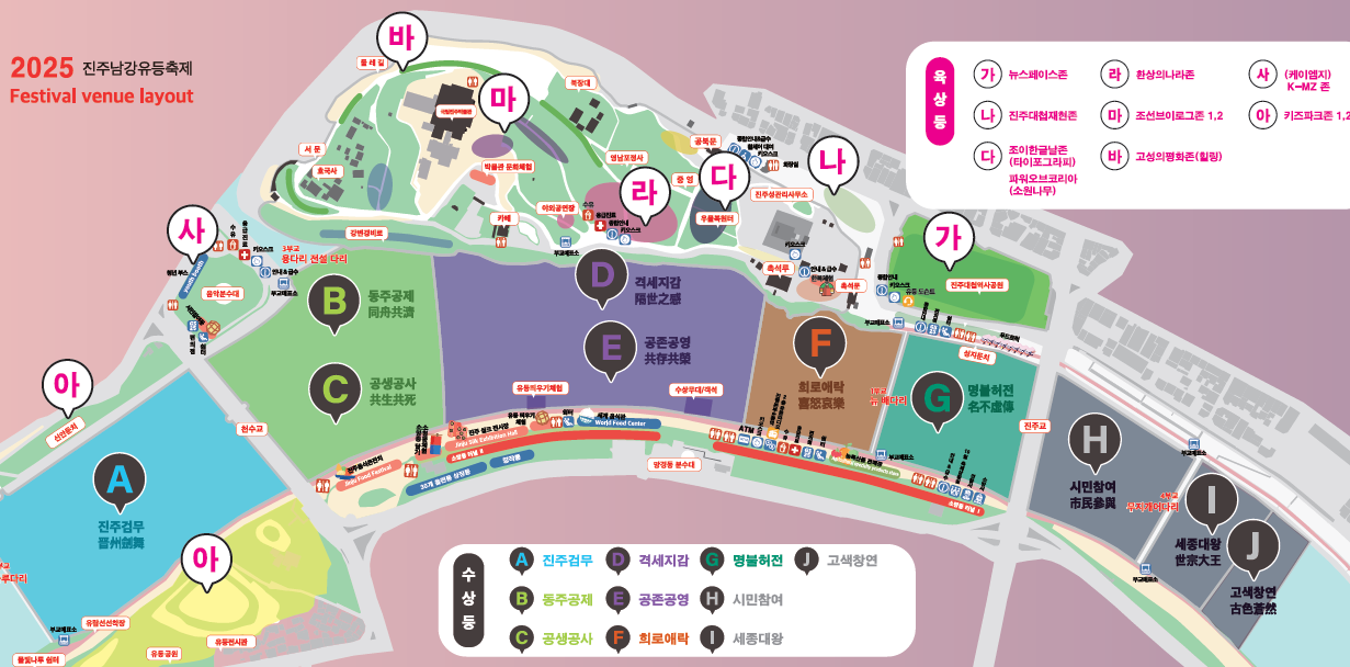 올해는 진주 지역의 공공기관과 기업이 직접 참여해 제작한 유등이 남강 수상에 전시됩니다. 시민과 지역 사회가 함께 만드는 축제로서, 단순히 관람객으로서의 역할을 넘어 창작의 주체로 참여할 수 있는 기회를 제공합니다. 또한 2023년과 2024년 ‘대한민국 등 공모대전’ 수상작이 재현되어 전시되며, 예술성과 창의성을 인정받은 작품들을 직접 만나볼 수 있습니다.