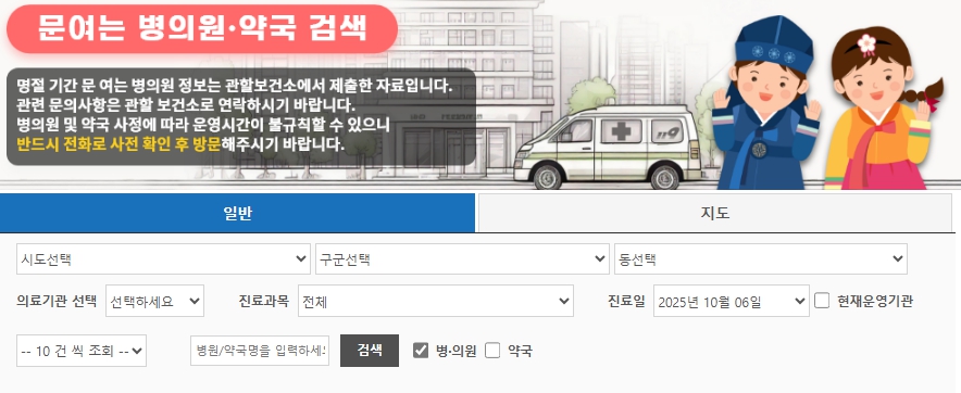 1. 홈페이지 이용: https://www.e-gen.or.kr 접속 → ‘연휴 병원 찾기’ 또는 ‘휴일지킴이약국 검색’ 메뉴 선택