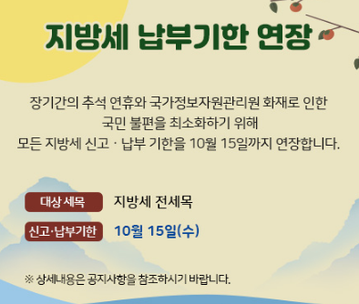 2025년에는 특이한 상황이 있었습니다. 행정안전부는 국가정보자원관리원에서 발생한 화재로 인해 일부 행정 서비스 이용에 차질이 발생하자, 국민 불편을 최소화하기 위해 지방세 납부 기한을 연장하기로 발표했습니다. 이에 따라 당초 9월 30일이 납부 마감일이었던 재산세 등 정기분 지방세뿐 아니라, 취득세처럼 수시로 납부되는 지방세 세목 전반의 신고 및 납부 기한이 일괄적으로 10월 15일까지 연장되었습니다.