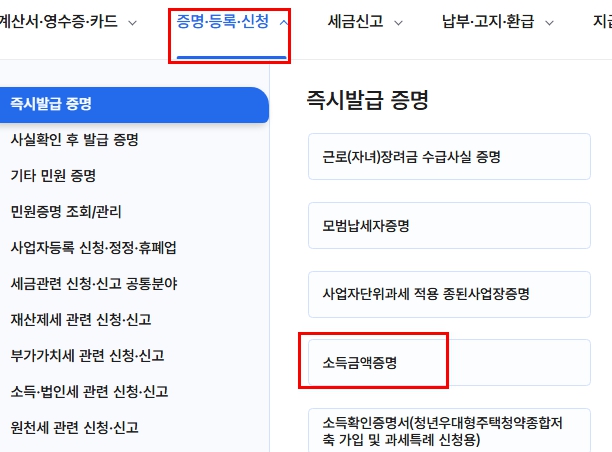 - [소득금액증명] 클릭