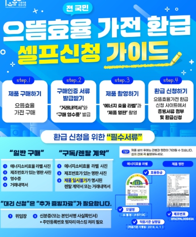 제품을 구입했다면 영수증, 제품 보증서, 효율 등급 라벨 사진을 반드시 보관해야 합니다. 온라인 구매 시 전자영수증이나 주문 내역서를 제출할 수 있습니다.