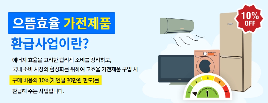 으뜸효율 가전제품 환급사업은 에너지 효율이 높은 제품을 소비자가 적극적으로 구매하도록 유도하기 위한 제도입니다. 냉장고, 세탁기, 에어컨 같은 대형 가전은 사용 시간이 길어 전력 소모가 크기 때문에, 이를 고효율 제품으로 교체하면 국가적으로도 전력 수요를 크게 줄일 수 있습니다.
