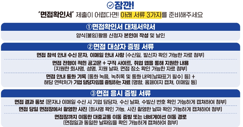 서류가 미비하거나 면접 사실이 명확히 확인되지 않는 경우 지원이 제한될 수 있으므로, 관련 증빙은 미리 준비하는 것이 좋습니다.