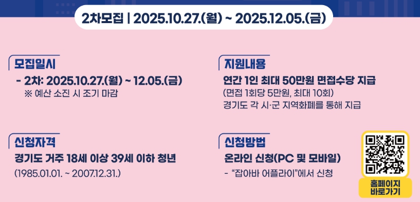 취업을 준비하는 청년이라면 누구나 한 번쯤 느껴봤을 면접 준비의 부담. 교통비, 복장 구입비, 식비 등 적지 않은 비용이 들기 마련인데요. 이러한 경제적 부담을 덜어주기 위해 경기도와 경기도미래세대재단이 ‘2025년 청년면접수당 2차 모집’을 진행합니다. 이번 사업은 면접비 부담을 완화하고 청년의 구직 의지를 높이기 위한 실질적인 지원 제도입니다.