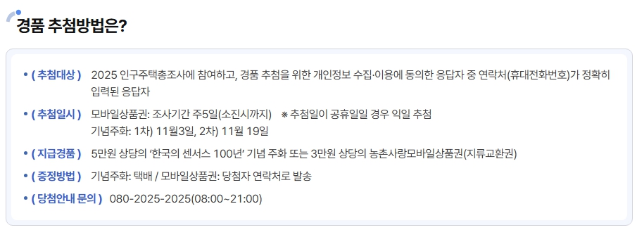 조사 참여 방법이나 경품 수령 관련 문의는 전용 상담센터 080-2025-2025로 연락하시면 됩니다. 상담시간은 매일 오전 8시부터 오후 9시까지이며, 외국어 상담이 필요한 경우 전용 번호를 통해 도움을 받을 수 있습니다.