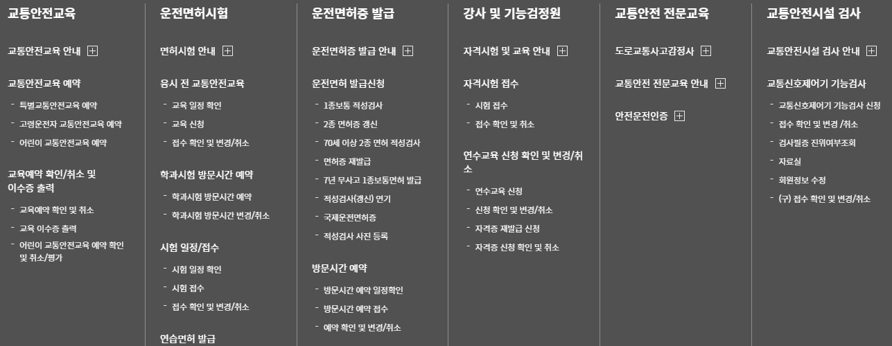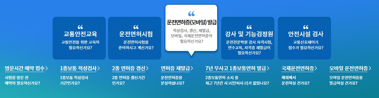 안전운전 통합민원은 운전면허 취득 절차뿐 아니라, 면허 갱신·적성검사 접수, 국제·영문운전면허증 발급 신청, 교통안전교육 예약, 각종 증명서 출력 등 운전자에게 필요한 민원을 통합 제공하는 온라인 행정시스템입니다.