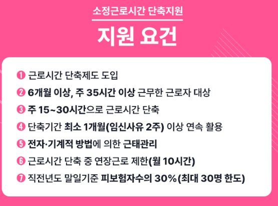 임신한 근로자는 임신일부터 출산휴가 전까지 최소 2주 이상 근로시간을 줄이는 경우에도 지원이 가능합니다. 단축 후 근로시간을 초과하여 근무할 경우 해당 월은 인정되지 않습니다.