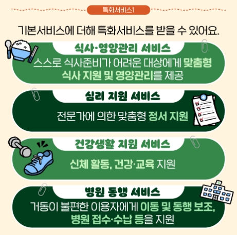 - 식사·영양관리: 질환 등으로 자가 식사 준비가 어려운 대상자에게 맞춤식 제공