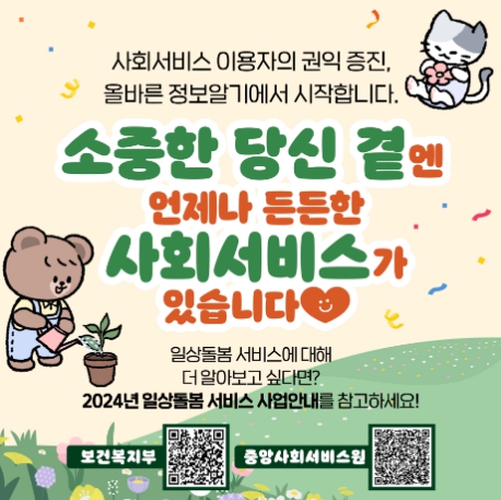 일상 속에서 돌봄이 필요하지만 마땅한 지원을 받기 어려운 청·중장년, 그리고 가족을 책임지는 청년들을 위해 마련된 제도가 ‘일상돌봄 서비스’입니다. 다양한 생활지원과 전문 돌봄 프로그램을 한 번에 이용할 수 있어 일상 유지가 어려운 분들에게 실질적인 도움을 제공합니다.