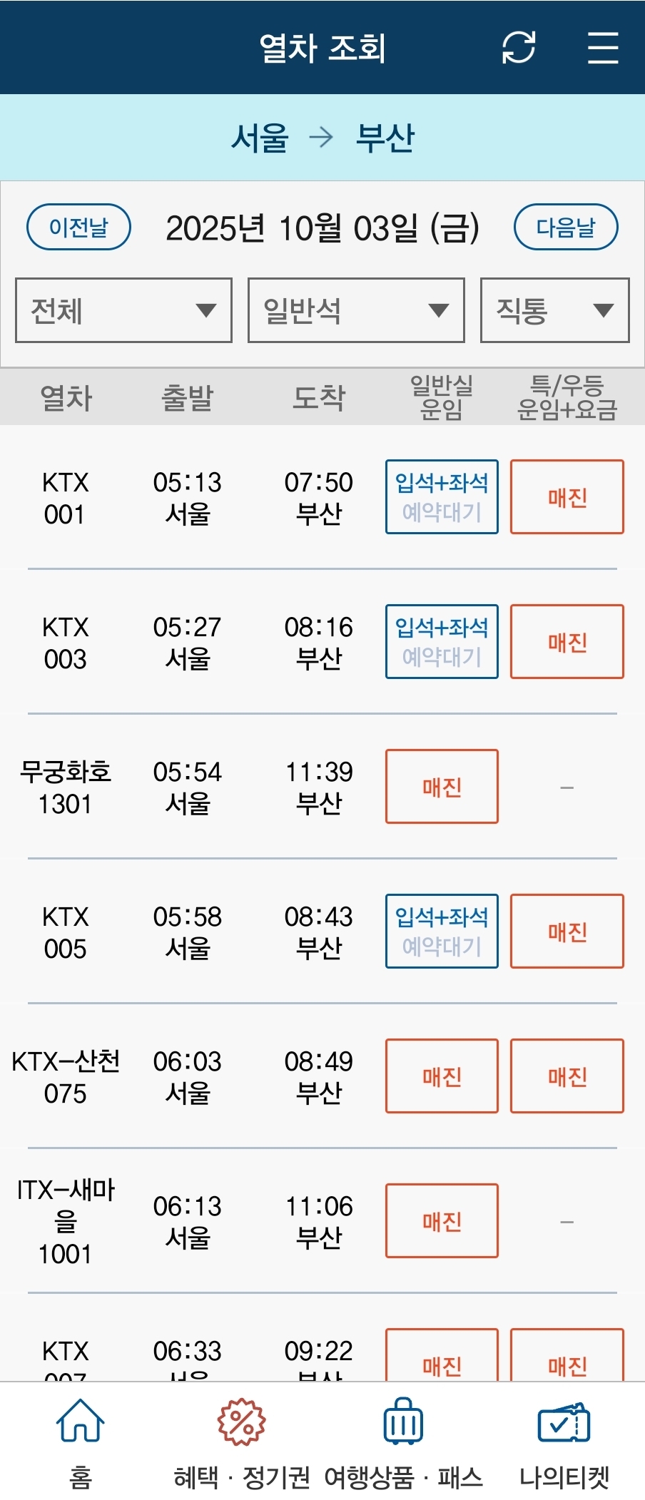 서울-부산 직행이 매진일 경우, 서울-대구 구간과 대구-부산 구간을 각각 예매하는 방법이 있습니다. 이른바 ‘구간 쪼개기’ 전략인데, 번거롭지만 좌석을 확보할 수 있는 확률이 크게 올라갑니다. 특히 명절에는 직행 노선보다 구간 분할 예약이 의외로 성공적인 경우가 많습니다.