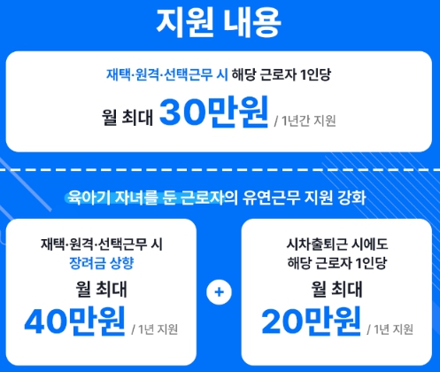 근무 환경 변화에 발맞춰 정부는 유연근무제를 운영하는 중소·중견기업에 장려금을 지원해 인건비 부담을 줄이고 조직 운영의 안정성을 높이고 있습니다.