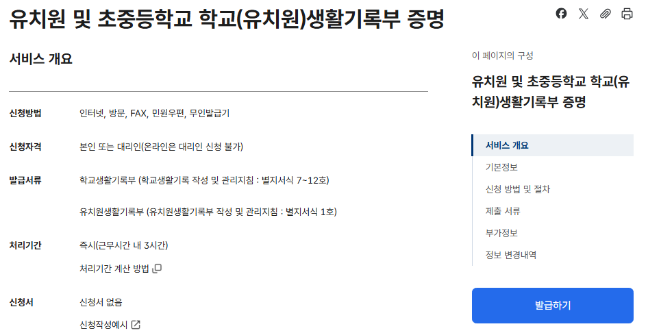 생활기록부는 초등학교, 중학교, 고등학교 재학생 및 졸업생의 학교생활기록부를 증명하는 서류로, 2003년 1월 이후 고등학교 졸업자부터 발급이 가능합니다.