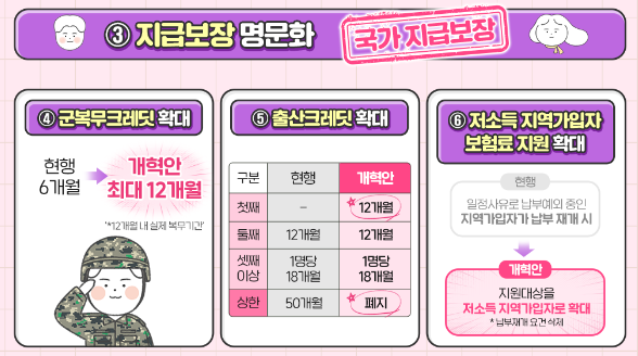 군 복무 크레딧도 최대 12개월까지 확대되며, 복무 기간 전체를 인정하는 방안이 단계적으로 추진됩니다.
